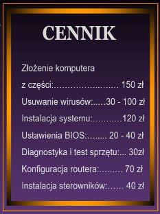 Ceny wszytkich usług są niewygórowane i przystępne. Przykładowy cennik do pobrania poniżej w formacie PDF.
